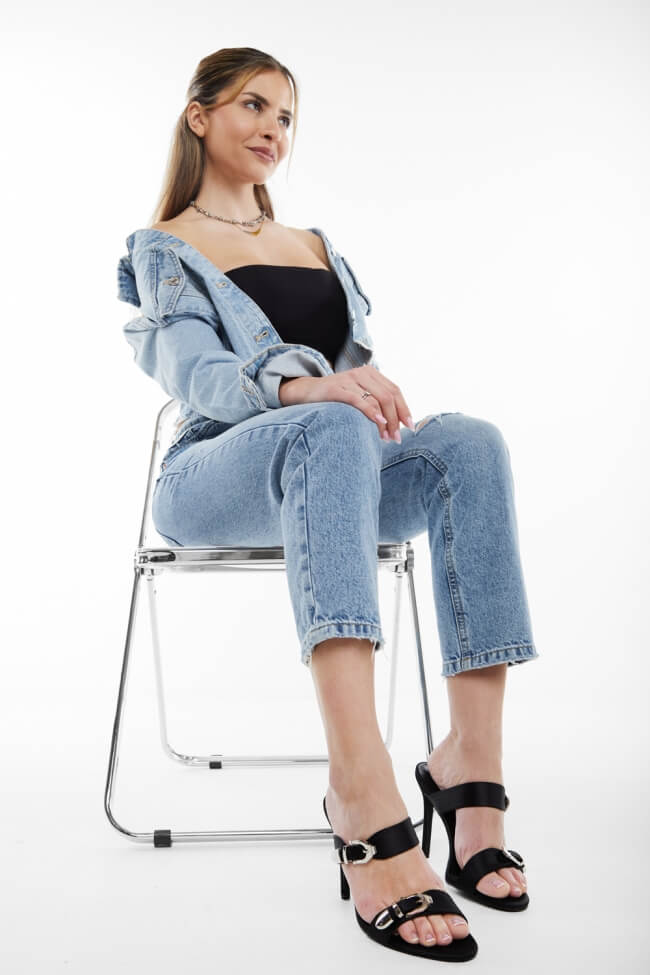 Съчети високотокови чехли с удобни mommy дънки, бяла риза и oversize сако за визия, която излъчва effortless елегантност.
