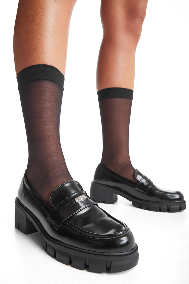 Scegli loafers alti con dettagli metallici o in texture particolari, come velluto o vernice, e indossali con abito lungo aderente o minigonna per un effetto glam.