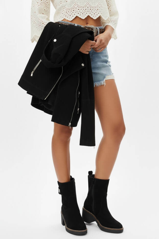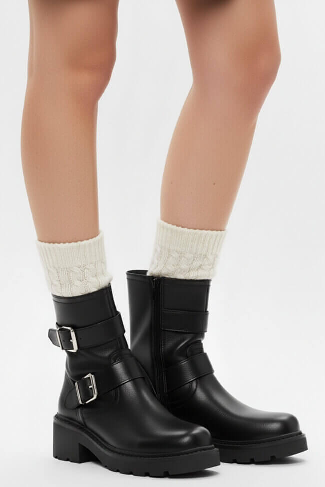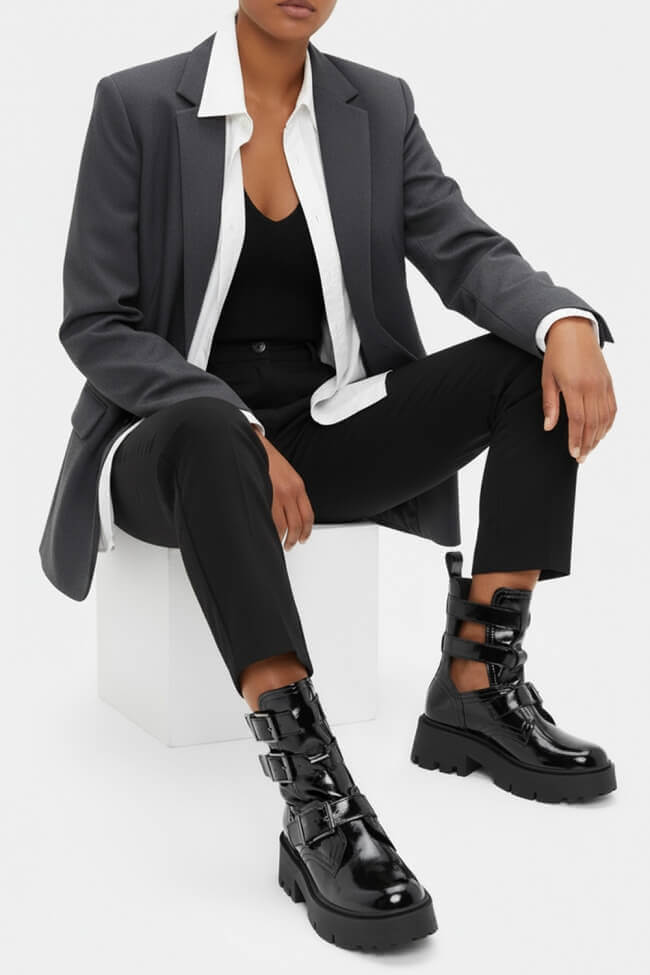 - Dacă îți plac piesele minimaliste, poți alege modele mai clasice, cum ar fi biker boots în paletă monocromă, care se potrivesc cu orice.